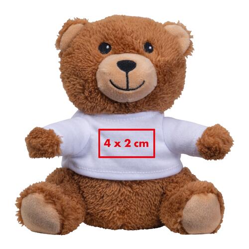 - Orsetto di peluche in poliestere con maglietta bianca in poliestere riciclato.